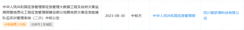我们非常荣幸地宣布,经过严格的评审和竞争,我司在中华人民共和国应急管理部应急管理 大数据工程及自然灾害监测预警信息化工程应急管理部建设部分地震地质灾害应急救援队伍实训管理系统(二次 )项目中成功中标!这一喜讯标志着我司在业务发展和市场竞争力方面取得了重大突破。